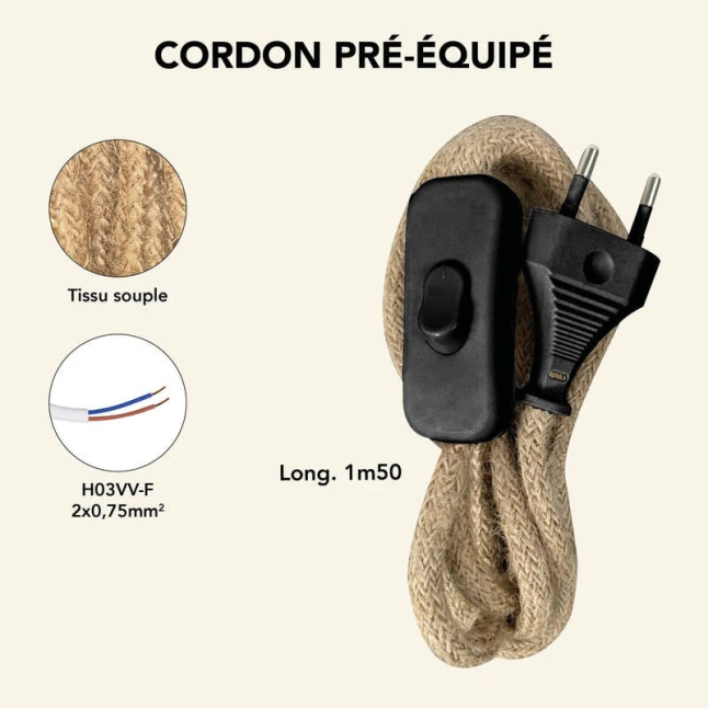 Le fil tissu rond en corde apporte un aspect naturel et chaleureux, avec une finition en jute et une teinte beige facile à assortir. Ce cordon électrique textile se voit et devient un élément de déco, tout en restant souple à manipuler. Les conducteurs 2x0,75 mm² sont adaptés aux usages courants d’éclairage intérieur. Pour les besoins réguliers, c’est un choix durable qui évite les câbles plastiques qui se marquent vite.