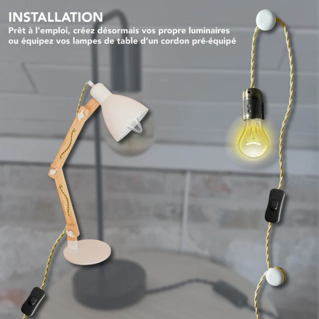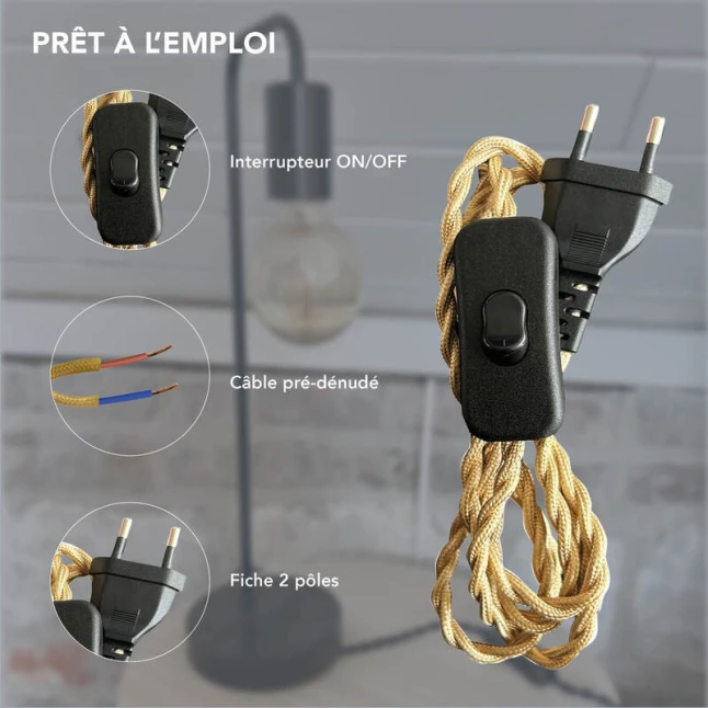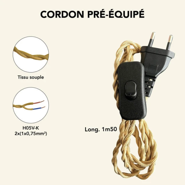 Le câble tissu vieil or apporte une finition décorative visible, tout en restant souple pour s’adapter aux projets de luminaire. Sa longueur de 1,5 m offre une portée confortable entre prise et point lumineux, sans excès de câble à gérer. La section 1x0,75 mm² convient aux usages d’éclairage courants. La couleur beige du cordon contraste avec la fiche et l’interrupteur noirs, pour un rendu net sur la plupart des ambiances.