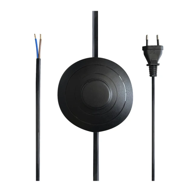 Ce cordon électrique noir de 3 m est un câble d’alimentation prééquipé, pratique pour une réparation ou une création de luminaire. Il intègre une fiche secteur 2 pôles et un interrupteur poussoir à pied, pour piloter l’allumage sans ajouter d’accessoire. Le câble H03VV-F 2x0,75 mm² est prévu pour une tension jusqu’à 250 V et un courant de 2 A, adapté aux éclairages de faible puissance.