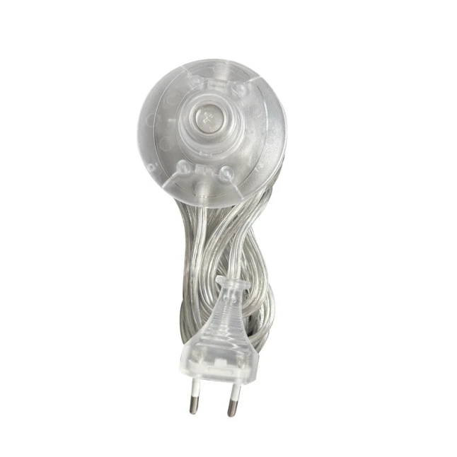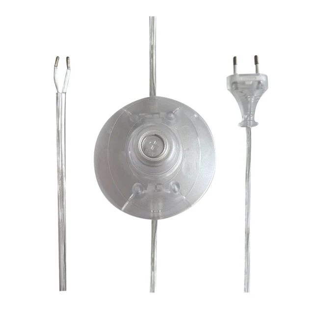Le câble transparent est prééquipé d’une fiche 2 pôles et d’un interrupteur poussoir rond. Il est conçu pour une tension de 250 V et une intensité de 2 A, adaptée aux petits appareils et à la plupart des lampes. Le fil H03VV-F 2x0,75 mm² offre un bon compromis entre souplesse et tenue, avec une gaine plastique facile à nettoyer et résistante aux manipulations répétées.