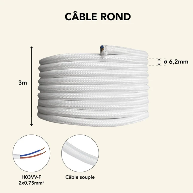 Ce câble électrique rond avec revêtement tissu blanc apporte une finition nette à vos luminaires visibles. Le gainage textile limite l’effet “câble plastique” et aide à mieux résister aux frottements du quotidien. La couleur blanche s’intègre facilement avec une suspension claire, une douille ou une rosace, sans attirer l’attention. Une solution simple quand le point bloquant est un cordon ancien, jauni ou abîmé.