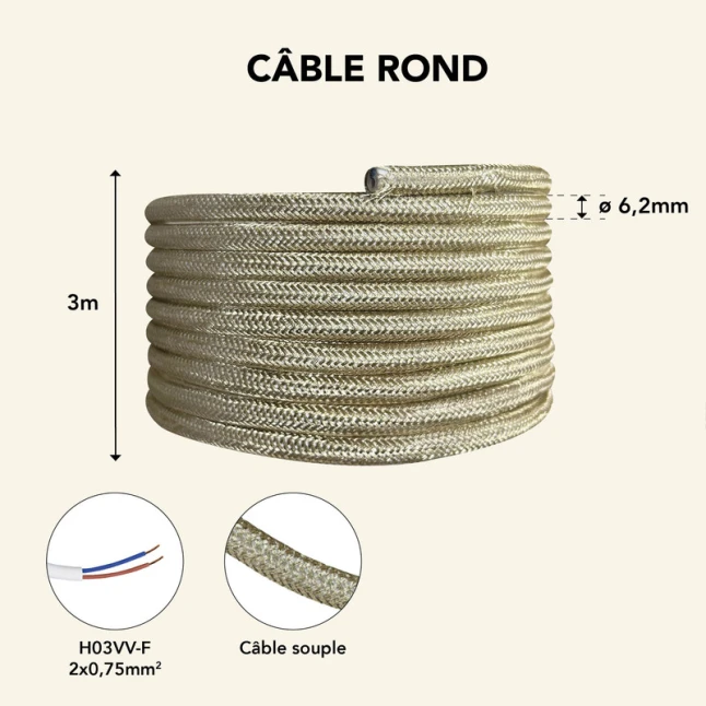 Ce câble électrique rond en tissu doré est conçu pour l’alimentation d’un luminaire. Il convient pour créer une suspension, réparer une lampe ou moderniser un éclairage dont le cordon est usé ou trop discret. La gaine textile apporte un rendu plus soigné qu’un câble plastique, tout en restant souple pour suivre la forme souhaitée. La couleur dorée s’intègre facilement avec des douilles et accessoires de finition.