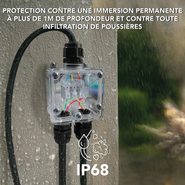 Ce boîtier de connexion étanche IP68 est conçu pour raccorder un ou plusieurs appareils en extérieur sans craindre l’humidité. Il répond au besoin fréquent de connexions qui prennent l’eau, s’oxydent et finissent par couper l’alimentation. Son indice IP68 indique une protection contre l’immersion permanente à plus de 1 m de profondeur, ce qui sécurise les raccordements exposés aux intempéries, aux projections ou aux zones très humides.