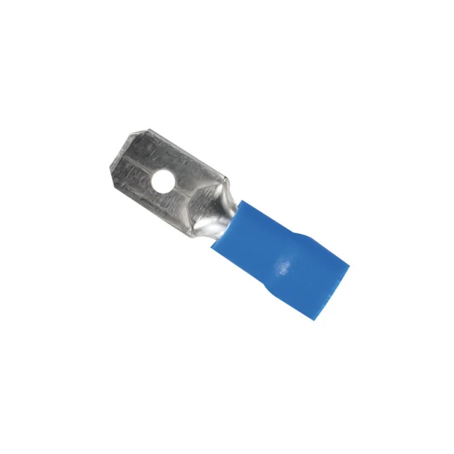 La languette mâle est prévue en largeur 6,4 mm, un format courant pour connecteur type Faston. Cela répond au doute le plus fréquent : l’adaptation avec une cosse femelle correspondante du même format. Le repérage par couleur bleue aide à reconnaître rapidement la bonne catégorie de section de câble. Ces cosses conviennent pour des conducteurs de 1 à 2,5 mm², pratique pour de nombreux câblages courants.