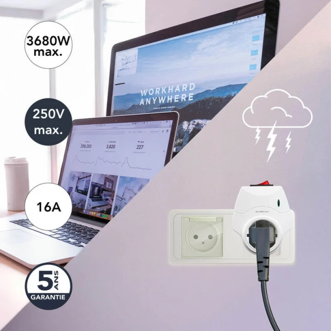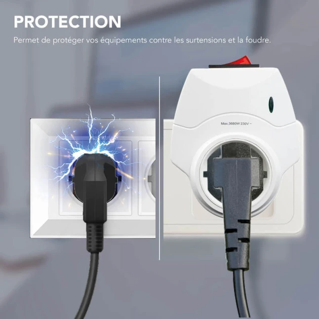 Cette prise parafoudre et prise parasurtenseur protège vos appareils sensibles contre les surtensions soudaines du réseau 230 V et les effets de la foudre. Elle répond au problème fréquent des coupures et micro-variations qui peuvent endommager l’électronique et réduire la durée de vie. Branchez-y ordinateur, TV, box, téléphone, alarme ou électroménager pour limiter les risques de panne liés aux pics de tension.