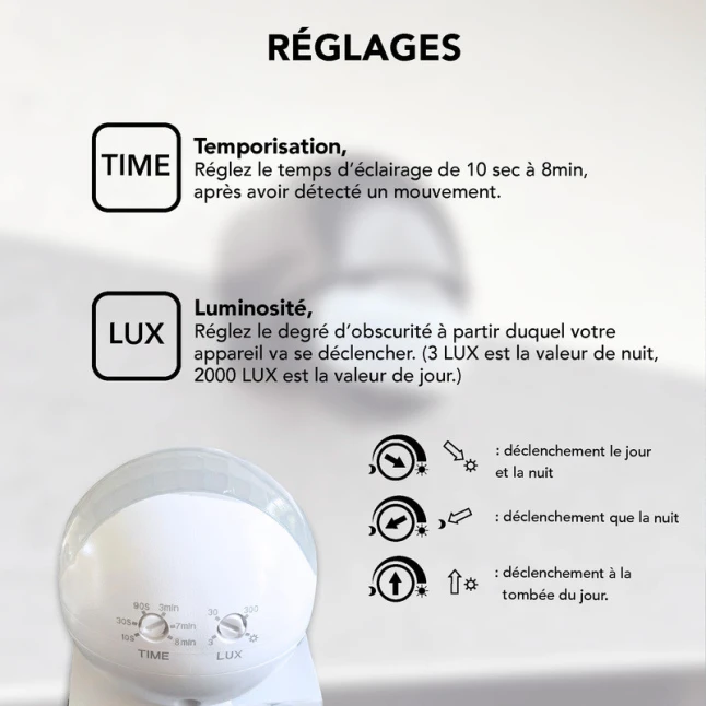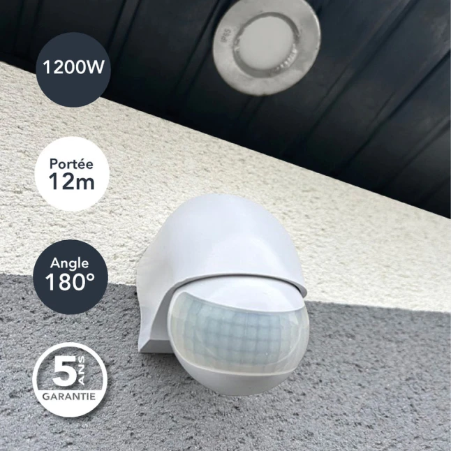 Pour éviter les déclenchements inutiles et adapter le fonctionnement à vos habitudes, ce détecteur infrarouge IP44 propose des réglages de temporisation et de seuil de luminosité. Vous ajustez ainsi la durée d’allumage et le déclenchement selon la lumière ambiante. Sa portée 12 m et sa zone 180° facilitent le ciblage d’une zone précise. La garantie 5 ans apporte une réassurance utile, y compris pour les chantiers réguliers.