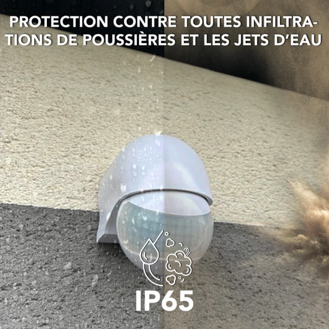 Conçu en plastique blanc discret, ce capteur de présence s’intègre facilement sur une façade, sous un auvent ou dans une zone humide. Son indice IP44 le protège contre les projections d’eau et la poussière, pour une utilisation en intérieur comme en extérieur sous abri. Si vous hésitez sur la compatibilité, il sert de commande pour piloter l’éclairage ou un dispositif raccordé, selon votre circuit.