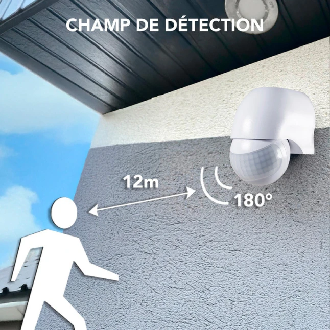 Ce détecteur de mouvement infrarouge blanc déclenche automatiquement l’allumage et l’extinction d’un appareil électrique au passage, comme un luminaire ou une alarme. Il répond au problème courant des éclairages oubliés allumés et des zones sombres à l’arrivée. La détection PIR couvre jusqu’à 12 m avec un angle de 180°, pratique pour une entrée, un garage, un couloir ou une allée.