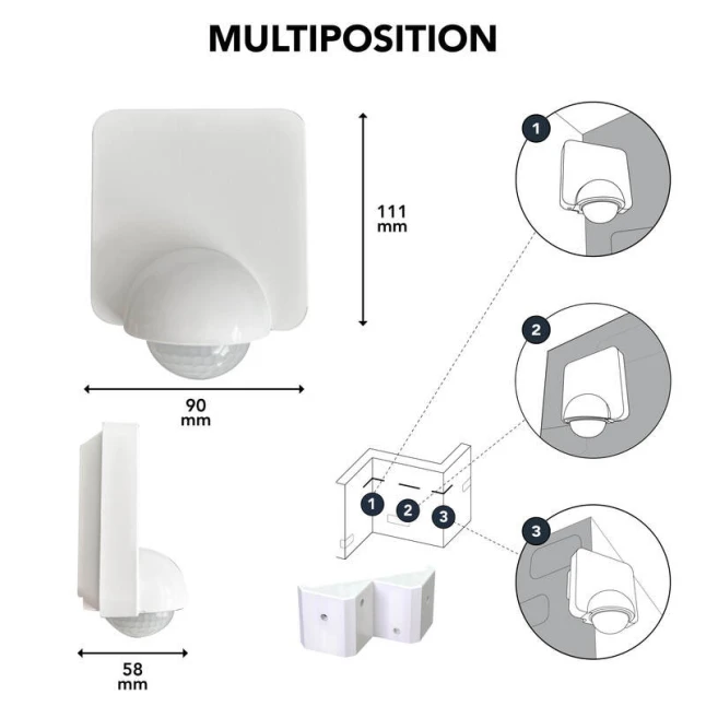 Conçu pour une utilisation en intérieur ou en extérieur, ce détecteur IP54 résiste aux projections d’eau et à la poussière du quotidien. Son boîtier en plastique blanc reste discret sur une façade, un porche ou dans un couloir. La fixation multi-position permet une pose murale classique ou en angle grâce au support amovible, pratique quand l’emplacement idéal se trouve dans un coin entrant ou sortant.