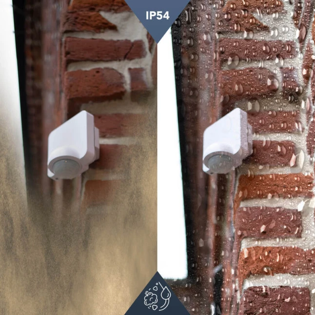Conçu pour une utilisation en intérieur ou en extérieur, ce détecteur IP54 résiste aux projections d’eau et à la poussière du quotidien. Son boîtier en plastique blanc reste discret sur une façade, un porche ou dans un couloir. La fixation multi-position permet une pose murale classique ou en angle grâce au support amovible, pratique quand l’emplacement idéal se trouve dans un coin entrant ou sortant.