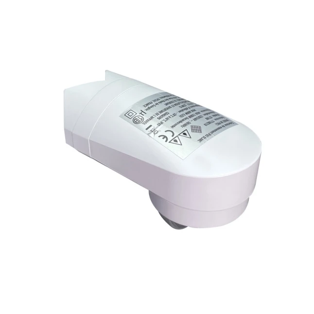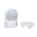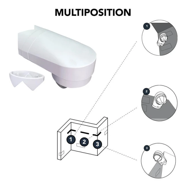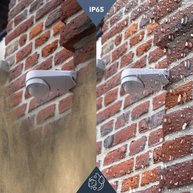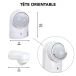 Conçu en plastique blanc et classé IP65, ce détecteur de présence résiste aux projections d’eau et à la poussière pour une utilisation en intérieur comme en extérieur. Son format multi-pose facilite l’adaptation à la configuration du lieu : montage mural classique ou fixation en angle grâce au support amovible, en angle sortant ou entrant. Cette souplesse évite les zones mortes et limite les déclenchements inutiles liés à un mauvais positionnement.