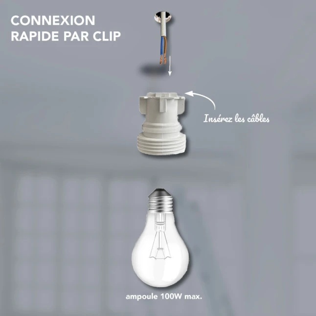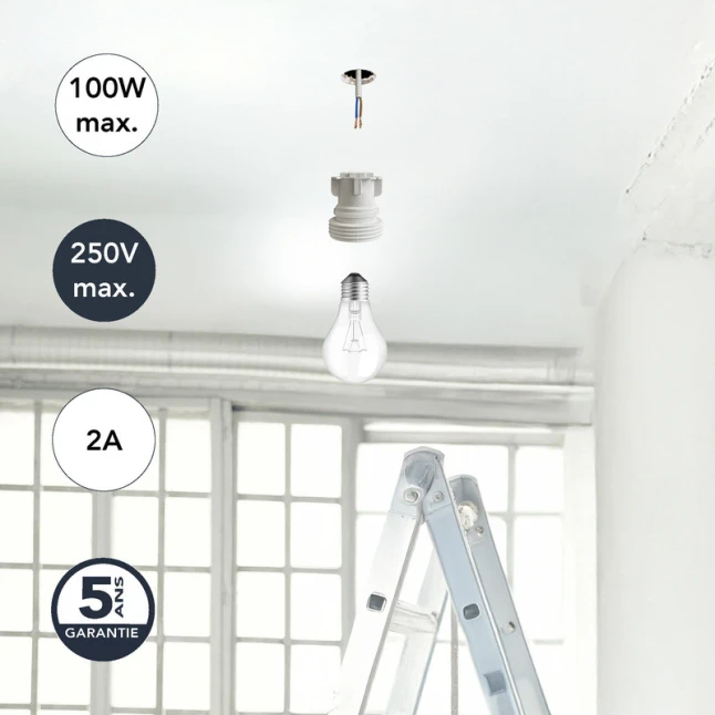 La douille E27 accepte les ampoules à gros culot standard, y compris une ampoule LED E27, tant que la puissance reste dans la limite de 100 W maxi. Elle est prévue pour du câble électrique de section 0,5 à 1,5 mm², un format fréquent sur les petits raccordements d’éclairage. Vous évitez ainsi le doute “est-ce que ça rentre ?” et “est-ce adapté à mon ampoule ?” grâce à des dimensions et limites simples.
