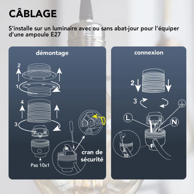 La douille est prévue pour être reliée à la terre, ce qui répond aux attentes de sécurité sur un corps en métal. Elle intègre aussi un dispositif qui bloque le dévissage après le premier montage, utile quand on veut éviter qu’une douille se desserre lors des manipulations, du changement d’ampoule ou des vibrations. La construction métallique aide à garder un bon maintien mécanique au quotidien, avec une garantie 5 ans pour rassurer sur la durée.