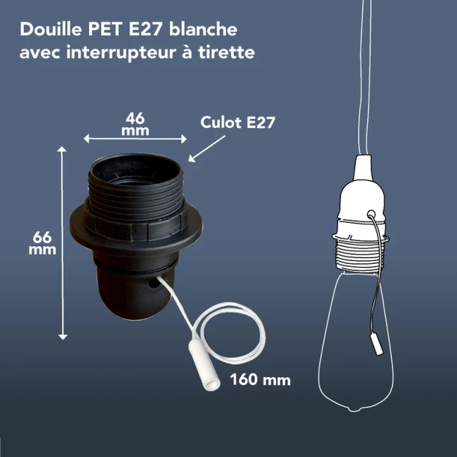 Le point fort est l’interrupteur à tirette intégré, pratique quand on veut allumer et éteindre la lampe sans ajouter un autre interrupteur. La tirette de 16 cm reste accessible, même lorsque l’ampoule est sous un abat-jour. Cela répond au besoin fréquent d’un contrôle simple au plus près du luminaire, utile au quotidien comme sur des montages en série lors d’une remise en état.