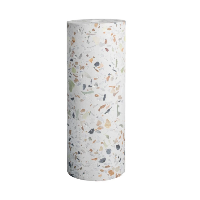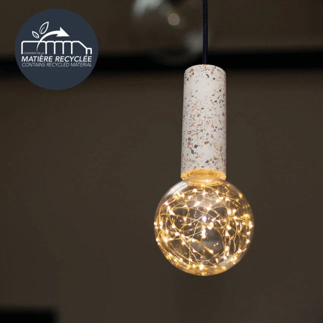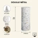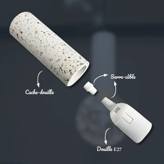 Le cache est en béton avec finition terrazzo blanc, pour un rendu minéral facile à assortir. Son format haut de 140 mm apporte une présence visuelle et aide à obtenir une ligne plus nette autour de la douille. Le béton est apprécié pour sa tenue dans le temps et sa résistance aux petits chocs du quotidien. Si vous cherchez un cache-douille béton terrazzo ou un cache douille 140 mm, ce format répond clairement à ces attentes.