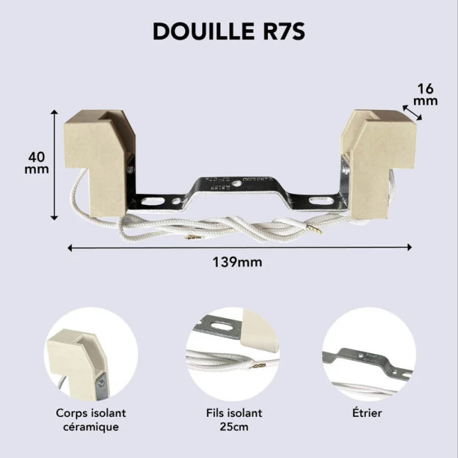 Le corps isolant en céramique (stéatite) est pensé pour supporter les températures élevées rencontrées avec certaines lampes R7S. La douille accepte jusqu’à 1000 W maximum, pour couvrir de nombreux projecteurs et luminaires puissants. Les fils silicone haute température, section 1,5 mm², longueur 25 cm, sont donnés pour 250 °C : un vrai plus pour limiter le vieillissement des connexions et gagner du temps en atelier.