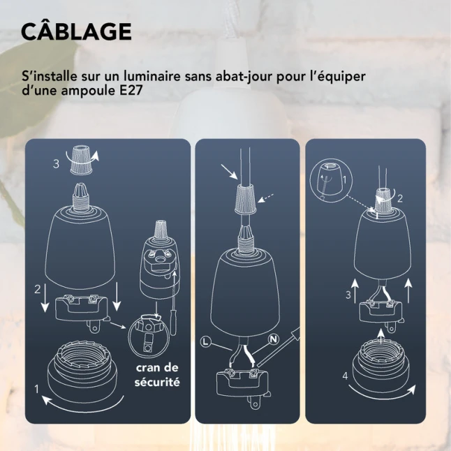 Le format E27 correspond au pas de vis le plus courant, compatible avec la majorité des ampoules E27 (LED, filament, classiques), ce qui évite les erreurs de culot au moment de l’achat. Avec un diamètre de 46 mm, le pavillon cache-fils reste discret tout en couvrant correctement la zone de raccordement. Si vous hésitez sur l’encombrement, ce diamètre facilite l’intégration sur des luminaires compacts et donne un rendu net une fois en place.