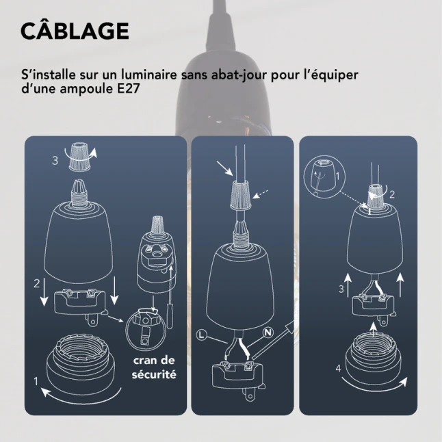 Cette douille céramique E27 noire est pensée pour équiper un luminaire sans abat-jour et recevoir une ampoule à culot E27 (gros culot). Le pavillon cache-fils intégré aide à masquer les raccordements et à obtenir un rendu net, même quand le câble reste visible. Elle répond au problème fréquent des douilles vieillissantes ou des créations DIY où l’on veut une pièce simple, discrète et facile à intégrer.