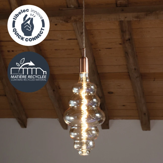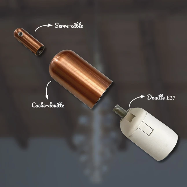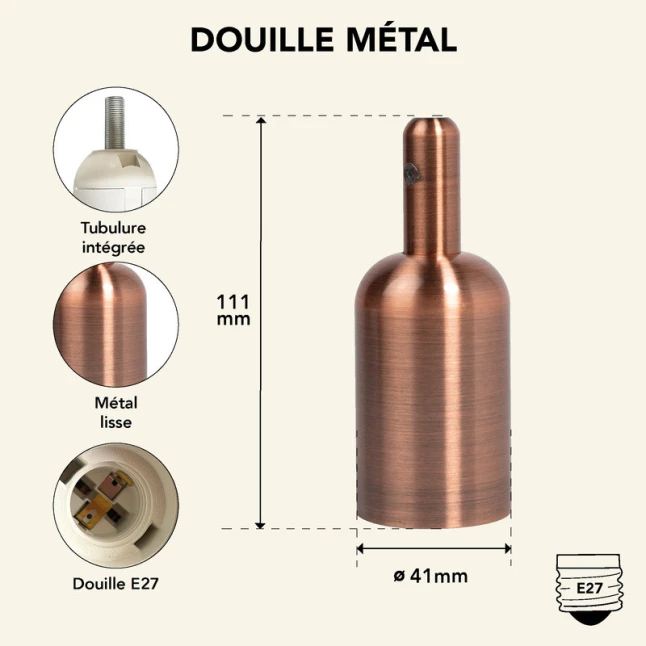 Conçu pour les ampoules à culot E27, ce support d’ampoule accepte facilement les formats courants, y compris ampoule LED E27 ou ampoule filament. Son habillage en métal offre une finition cuivrée type cuivre brossé, proche d’un or rose, pour s’accorder à des câbles textiles, des rosaces ou des luminaires déco. Le cache douille rond et cylindrique masque les éléments techniques et donne un aspect plus soigné.