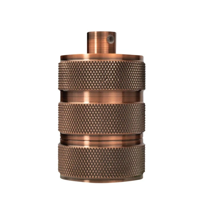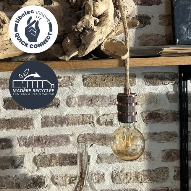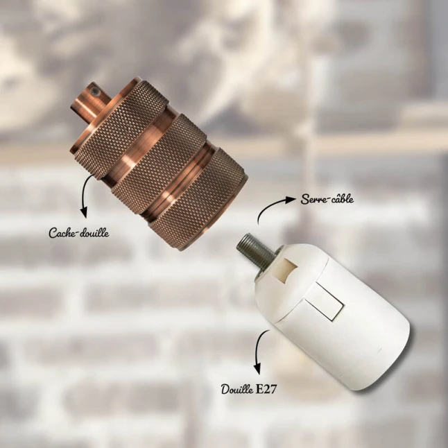 Ce kit associe une douille métal E27 et un cache-douille à trois bandes, finition cuivrée. Il apporte une touche chaleureuse et contemporaine à une suspension ou une lampe, surtout quand l’ampoule reste apparente. Le métal donne un aspect propre et durable, tout en protégeant et en habillant la zone de connexion. Idéal si vous cherchez une finition nette plutôt qu’un montage “brut” visible.