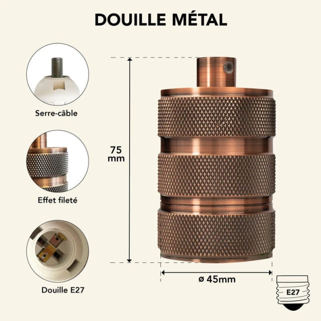 La douille E27 correspond au culot à vis le plus répandu. Elle convient à la majorité des ampoules E27 disponibles (LED, filament, décoratives) et s’adapte facilement aux projets de luminaire DIY. Vous évitez le doute sur le bon format grâce au standard E27. Le cache douille métal complète l’ensemble en masquant l’interface du luminaire pour un rendu harmonieux, sans dénaturer le style de l’ampoule choisie.