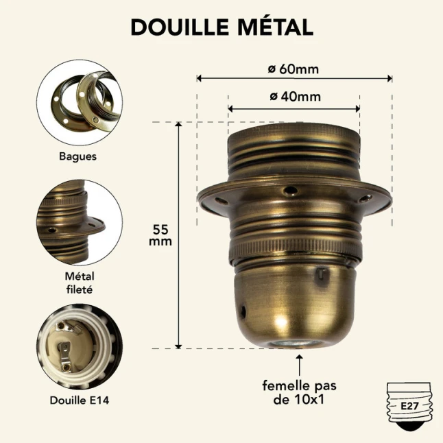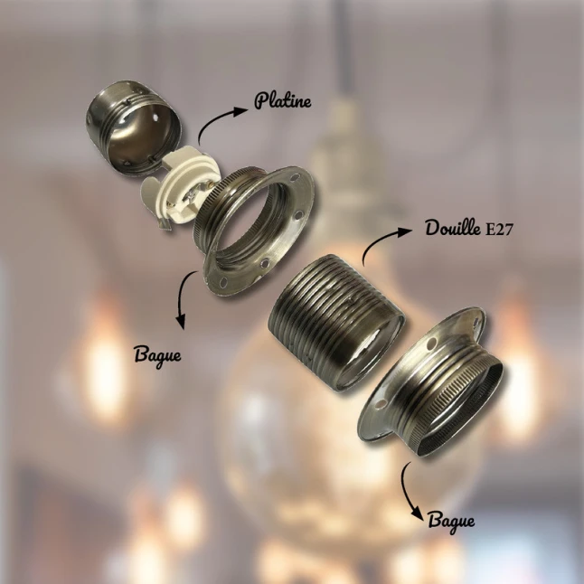 La finition bronze antique apporte un rendu sobre et chaleureux, adapté aux suspensions, lampes de table et appliques. Le corps en métal offre une bonne résistance mécanique et une meilleure durabilité qu’une douille plastique sur des luminaires manipulés ou transportés. Son filetage assure un assemblage net et stable, utile quand on veut éviter les jeux et les pièces qui se desserrent avec le temps, notamment sur des montages reconditionnés.