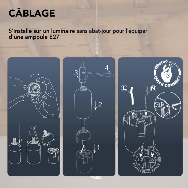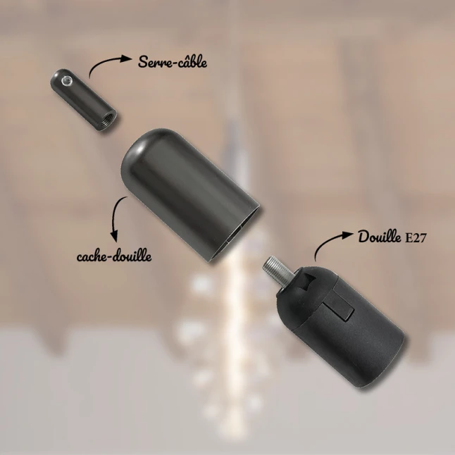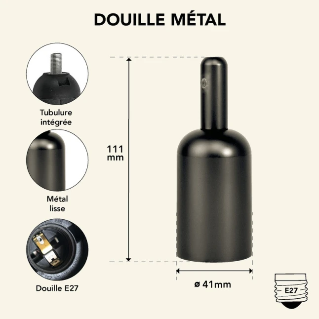 Le métal apporte une sensation de robustesse et une meilleure tenue dans le temps qu’une finition plus légère, notamment sur des luminaires manipulés ou déplacés. La couleur titane reste discrète et limite les traces visuelles autour de la zone de douille. Pour gagner du temps lors d’un remplacement, l’ensemble douille métal E27 + cache douille assure une finition homogène, appréciable quand on doit obtenir un rendu propre et régulier sur plusieurs points lumineux.