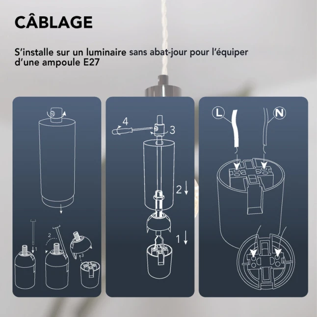Le porte-ampoule E27 accepte les ampoules à culot E27 standard, faciles à trouver en LED ou filament. Vous n’avez pas à vous soucier d’un format spécifique : la douille est prévue pour ce culot courant, utilisé sur la plupart des ampoules domestiques. Le cache douille métal aide aussi à garder une apparence homogène quand l’ampoule est visible. La conception en métal apporte une sensation de solidité au quotidien.