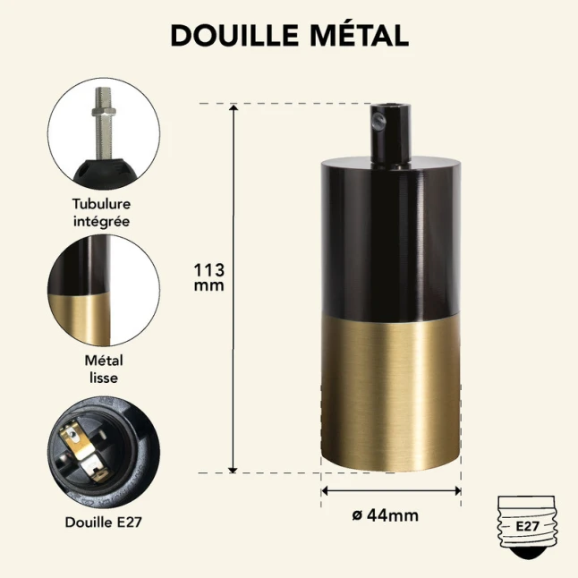 Ce kit réunit une douille E27 et un cache-douille en métal au format cylindrique, avec une finition noir et doré. Il permet d’équiper un luminaire laissé “nu” avec une ampoule à culot E27 tout en masquant la zone de raccordement pour un rendu plus net. C’est une solution simple quand une suspension paraît inachevée ou quand vous voulez un style industriel discret, sans ajouter d’abat-jour.