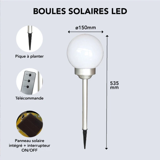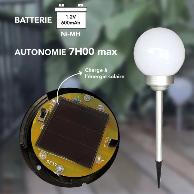 Chaque lampe solaire à piquer combine une boule de diamètre 150 mm et une hauteur totale de 535 mm, pratique pour rester visible au-dessus d’un bord de pelouse ou d’un petit massif. Le diffuseur en plastique est conçu pour un usage extérieur courant, avec une finition aluminium qui apporte un aspect plus net. Ce format de balise solaire convient aussi bien pour un petit jardin que pour des alignements plus longs, en ajoutant plusieurs lots.