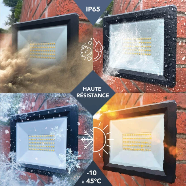 Avec son indice de protection IP65, ce projecteur LED étanche résiste à la pluie et à la poussière, pour une utilisation en extérieur au quotidien. Son corps en métal et sa finition blanche sont pensés pour tenir face aux contraintes météo et aux variations de température. Vous gagnez en tranquillité sur la tenue dans le temps, tout en gardant une lumière stable adaptée aux zones exposées.