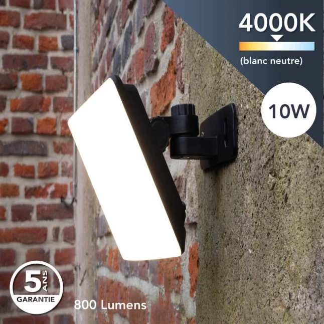 Ce projecteur LED extérieur 10W délivre 800 lumens pour éclairer efficacement une entrée, une allée de garage ou une petite zone autour de la maison. La technologie full screen (diffuseur plein écran) apporte une lumière homogène, sans zones sombres, utile quand on veut voir nettement le sol et les obstacles. La teinte 4000K blanc neutre donne un rendu naturel, confortable au quotidien.