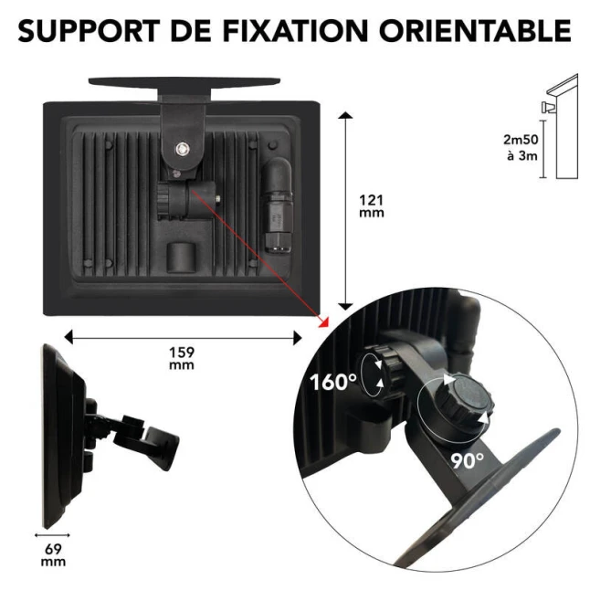 Le support de fixation orientable et le diffuseur orientable permettent d’ajuster l’éclairage précisément là où vous en avez besoin, sans éclairer inutilement les alentours. Le connecteur rapide intégré facilite le raccordement et limite les manipulations, un gain de temps utile aussi bien pour un chantier que pour un remplacement. Sa puissance de 30W et ses dimensions compactes en font un choix équilibré quand on cherche un projecteur 2500 lm efficace, sans surdimensionner l’éclairage.