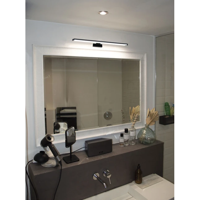 Cette réglette miroir LED noire apporte une lumière claire pour se raser, se maquiller ou vérifier les détails sans plisser les yeux. Avec 8 W et 650 lm, l’éclairage est efficace tout en restant sobre en consommation. La teinte 4000 K, blanc neutre, limite l’effet trop froid et rend les couleurs plus naturelles. Son angle de 120° diffuse largement la lumière et réduit les ombres autour du visage.