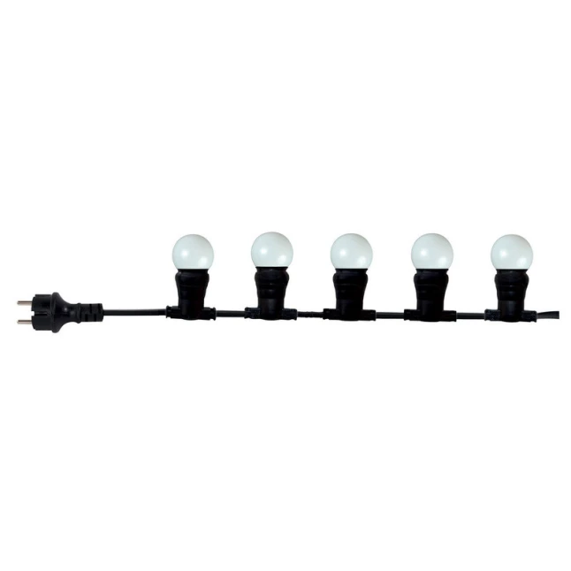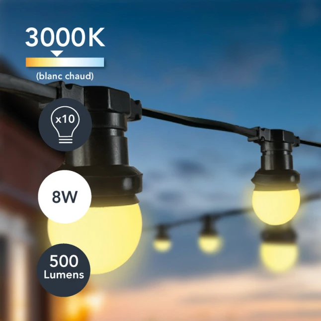 Cette guirlande lumineuse type guinguette apporte une lumière blanche claire pour créer une atmosphère conviviale en quelques secondes. Sur 10 mètres, elle offre 10 points lumineux avec ampoules LED fournies, chacune de 0,8 W pour environ 50 lm. Vous profitez d’un éclairage décoratif agréable sans forte consommation, idéal pour une terrasse, un balcon, une pergola ou une pièce de vie. Le rendu reste homogène sur toute la longueur.