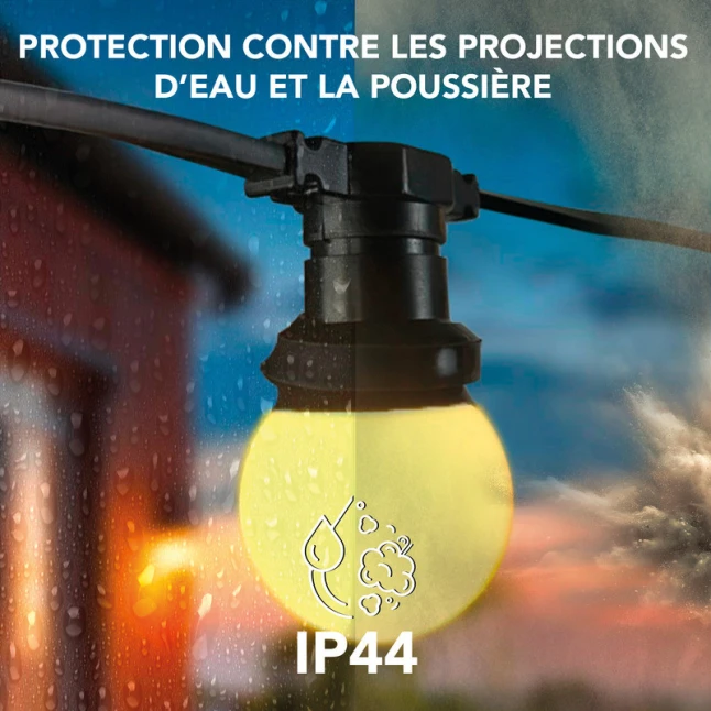 Un doute fréquent concerne la tenue dehors face aux intempéries. Avec sa protection IP44, la guirlande résiste aux projections d’eau et à la poussière, ce qui la rend adaptée à un usage extérieur sous abri comme à l’intérieur. Les ampoules en polycarbonate haute résistance limitent les casses lors des manipulations et des chocs du quotidien. C’est un choix rassurant pour des décorations récurrentes, saison après saison.
