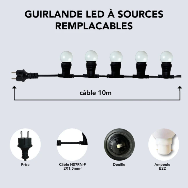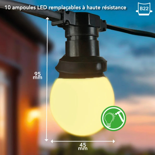 Les ampoules sont au culot B22, un format très courant, ce qui évite les mauvaises surprises au remplacement. La présence de lampes remplaçables répond à un vrai point sensible : si une ampoule est endommagée, il n’est pas nécessaire de changer toute la guirlande. Pour les usages intensifs, cela facilite la maintenance et réduit les coûts dans le temps. Longueur 10 m et 10 ampoules, pour dimensionner facilement votre décor.