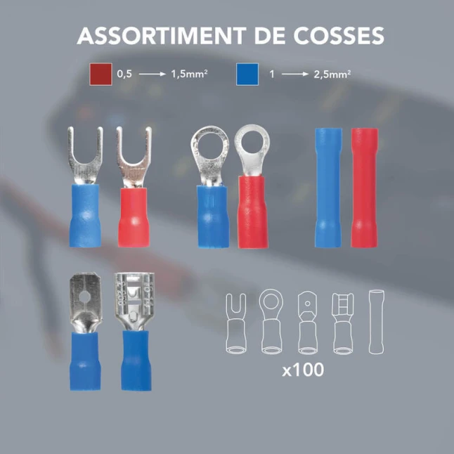 Le coffret comprend 100 cosses à sertir assorties pour couvrir les besoins les plus fréquents en câblage. Les cosses rouges conviennent aux fils de 0,25 à 1,5 mm², et les cosses bleues aux sections de 1 à 2,5 mm². Cela répond au doute le plus courant sur la compatibilité : vous choisissez simplement la cosse selon la section du câble. Résultat attendu : des raccordements plus fiables, moins de faux contacts, et un gain de temps appréciable lors des dépannages ou montages en série.