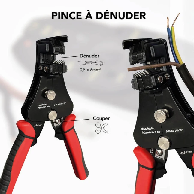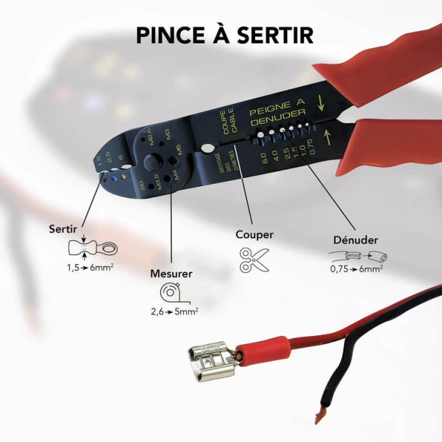 Ce kit réunit deux outils complémentaires pour préparer des connexions propres sans multiplier l’outillage. La pince à sertir permet de sertir des cosses sur des sections de 1,5 à 6 mm², et sert aussi à couper et dénuder des câbles de 0,75 à 6 mm², avec une fonction de mesure de câble (2,6 à 5 mm). La pince à dénuder automatique “dinosaure” coupe et dénude de 0,5 à 6 mm², avec une longueur de dénudage jusqu’à 15 mm.