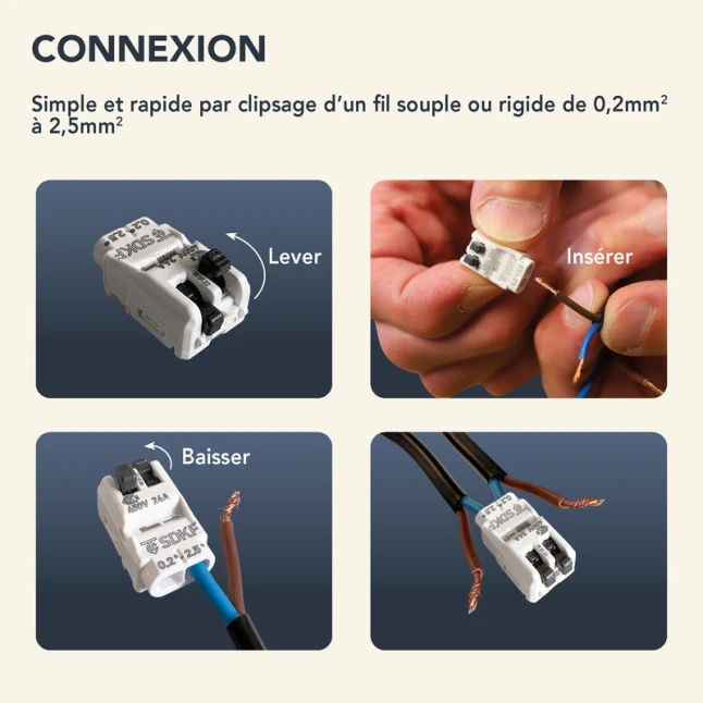 Ces borniers 3 entrées sont conçus pour des fils rigides ou semi-rigides, avec une section de câble de 0,2 à 2,5 mm². Ils conviennent aux circuits courants et supportent une tension jusqu’à 450 V, ce qui rassure quand on veut un raccord fiable sans surdimensionner. Si vous aviez un doute sur la compatibilité, retenez qu’ils sont pensés pour des conducteurs mono-brin ou semi-rigides, pour des connexions nettes et stables.