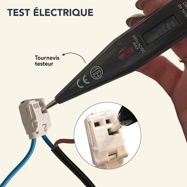 Un point de test intégré permet de vérifier la présence de tension sans ouvrir le raccordement, pratique pour un contrôle rapide. Cette borne de raccordement limite les reprises, car le levier maintient le fil de façon constante une fois fermé. Pour les interventions répétées, on gagne du temps et on réduit les risques d’abîmer les conducteurs lors des démontages. La connexion reste accessible et propre, même quand l’espace est compté.