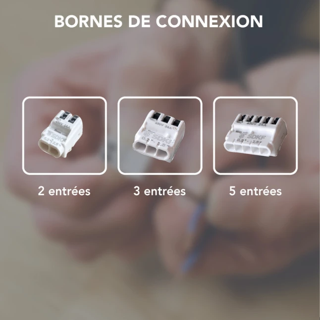 Ce lot de 5 bornes de connexion rapide permet de raccorder deux fils en un geste, grâce au levier. Il remplace avantageusement une barrette domino quand on manque de place ou qu’on veut éviter les vis à resserrer. Le clipsage est simple et limite les faux contacts liés aux serrages irréguliers. La couleur blanche se repère facilement dans une boîte de dérivation et garde un câblage plus lisible.