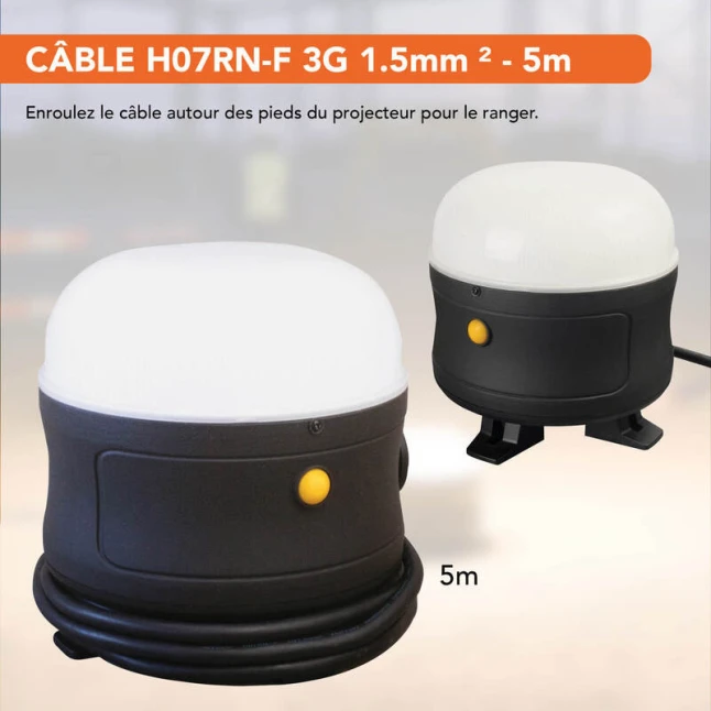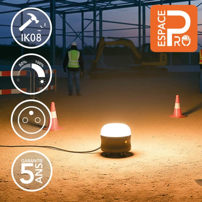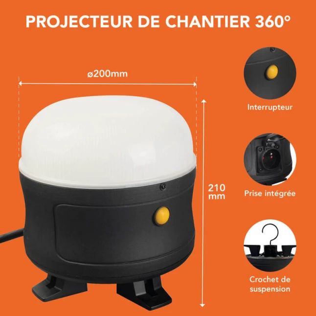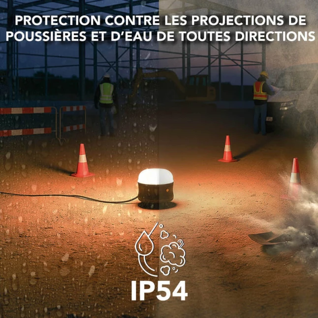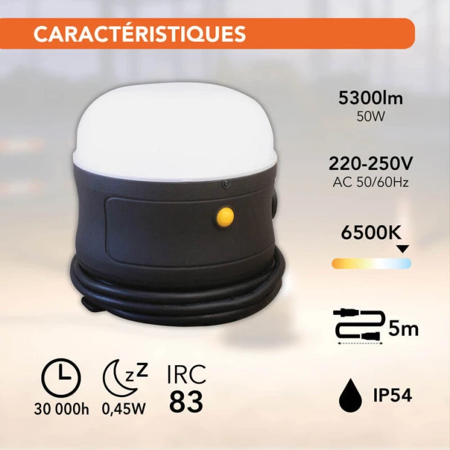 Ce projecteur LED de chantier 360° offre un éclairage uniforme, utile quand une seule source doit couvrir tout un espace de travail. Avec 50W et jusqu’à 5300 lumens, vous limitez les zones d’ombre sans multiplier les lampes. La lumière 6500K donne un blanc net, pratique pour distinguer clairement les détails et les couleurs. Son IRC 83 aide à garder un rendu fiable, notamment pour les finitions et les contrôles.