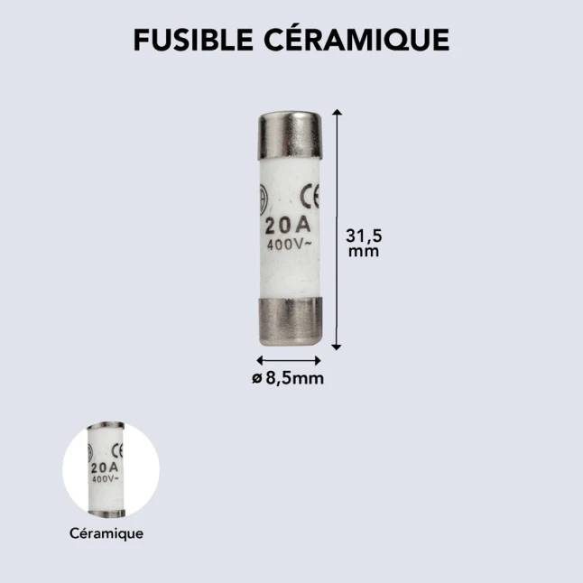 Le point de doute le plus courant est la compatibilité. Ici, le format cartouche 8,5 x 31,5 mm est indiqué pour correspondre aux emplacements prévus pour cette dimension. Le calibre 20 A sert à remplacer un fusible de même intensité, et la tension 400 V couvre les usages habituels sur de nombreux tableaux électriques. Ce repérage clair limite les confusions entre tailles proches et calibres différents.