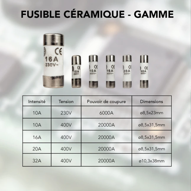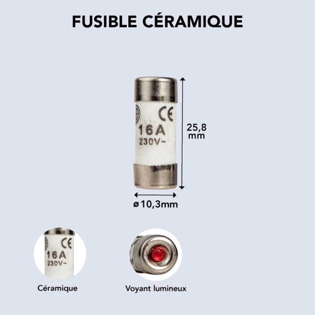 Ces fusibles sont au format 10,3 x 25,8 mm, une dimension utilisée sur des porte-fusibles de tableaux plus anciens. Avant achat, le point clé est de vérifier la taille 10.3x25.8 mm ainsi que le calibre 16A, pour rester conforme au besoin du circuit. Pensés pour les réseaux 230V, ces fusibles en céramique sont adaptés lorsqu’un remplacement par disjoncteur n’a pas été réalisé.