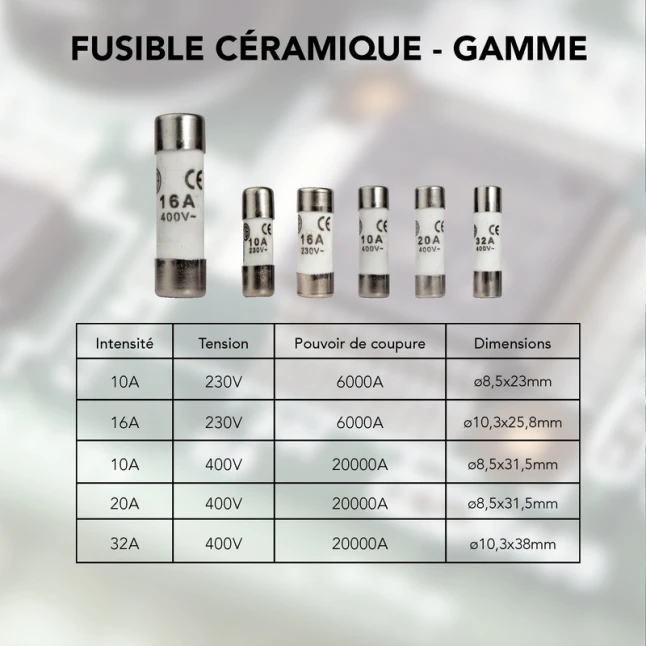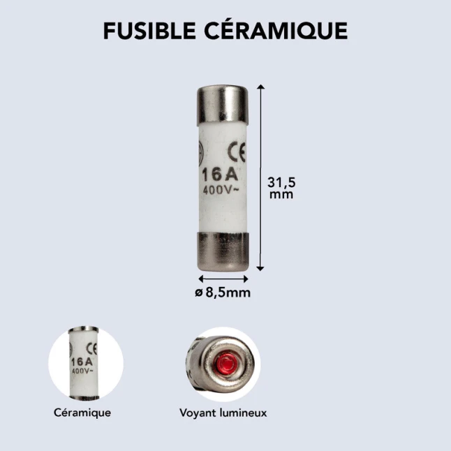 Le format 8,5 x 31,5 mm est une dimension à vérifier avant achat : il doit correspondre au porte-fusible existant. Ces fusibles céramique 8,5x31,5 sont fournis par lot de 3, utile pour garder un remplacement compatible sous la main. Ils sont adaptés aux besoins de protection en 16A, tout en restant simples à intégrer dans une maintenance courante. Le repérage par voyant aide à éviter les confusions de calibre.