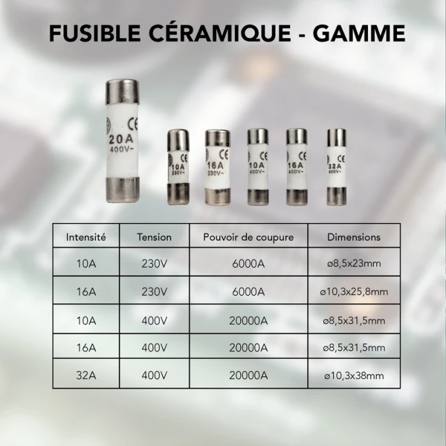 Ces fusibles en céramique protègent un circuit contre les surcharges en coupant l’alimentation lorsque l’intensité dépasse la limite prévue. Ils conviennent aux équipements encore dotés de porte-fusibles, notamment sur des installations anciennes non remplacées par des disjoncteurs. Le calibre 20 A et la tension jusqu’à 400 V couvrent de nombreux usages courants. La céramique offre une bonne tenue à la chaleur et une protection fiable au quotidien.