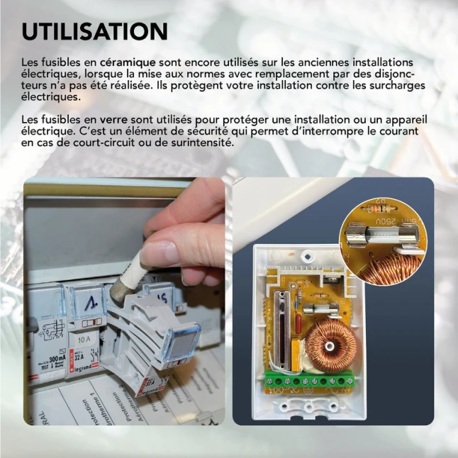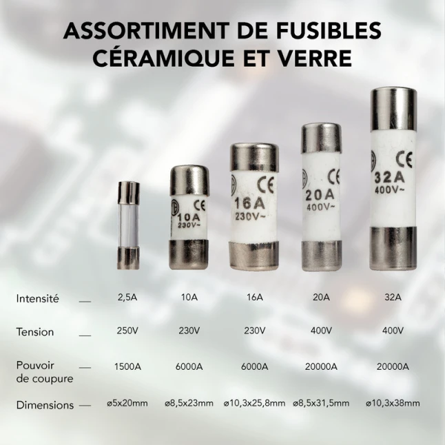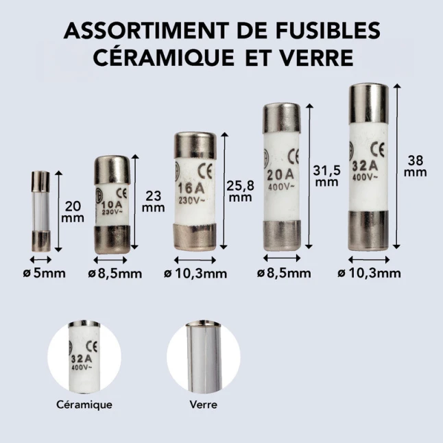 Le doute le plus fréquent concerne la compatibilité : ici, les dimensions sont précisées pour faciliter le remplacement à l’identique. Vous retrouvez notamment 8,5x23mm en 10A, 10,3x25,8mm en 16A, 8,5x31,5mm en 20A, et 10,3x38mm en 32A, plus 5x20mm en verre pour 2,5A. En choisissant le bon format et la bonne intensité, vous conservez une protection cohérente avec le support prévu.