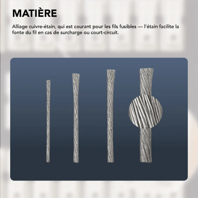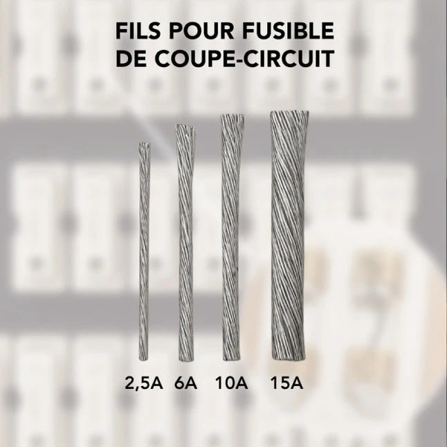 Fabriqués en cuivre-étain, ces fils offrent une bonne conductivité et une tenue stable dans le temps, avec une finition métal gris. Ce matériau est choisi pour conserver un contact fiable et une réponse régulière lors de la fusion, point clé d’un fil fusible. Pour les interventions répétées, l’assortiment fait gagner du temps grâce à la disponibilité immédiate des valeurs 2,5/6/10/15 ampères, tout en restant simple à identifier et à stocker.