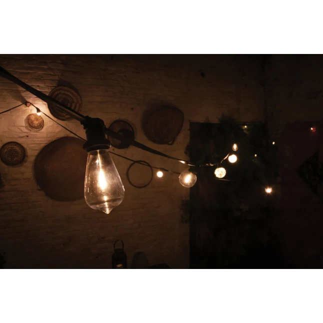 Le culot E27 est un format courant, pratique pour remplacer une ampoule de guirlande à douille E27 ou compléter une installation existante. Le corps mesure 64 x 140 mm : ces dimensions aident à vérifier rapidement l’encombrement dans un abat-jour, une suspension ou une guirlande. La finition incolore laisse bien passer la lumière et met en valeur l’effet filament, sans teinte parasite.